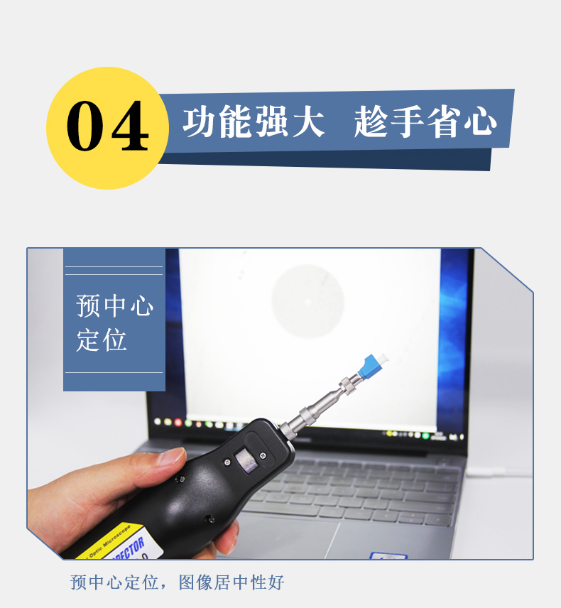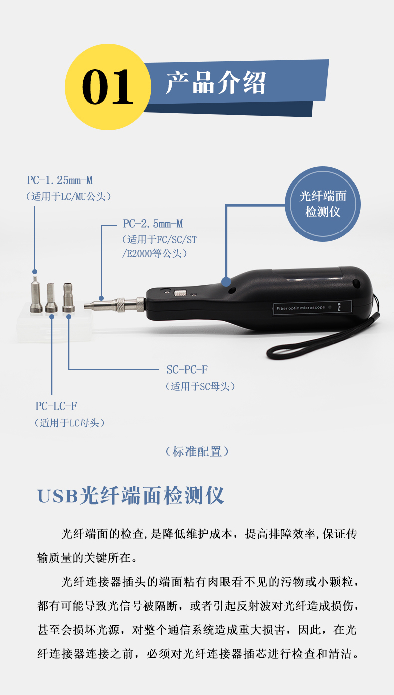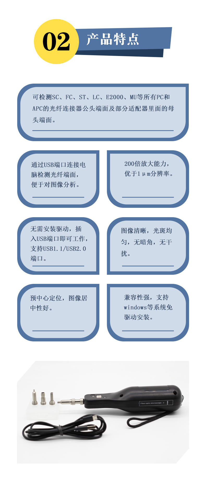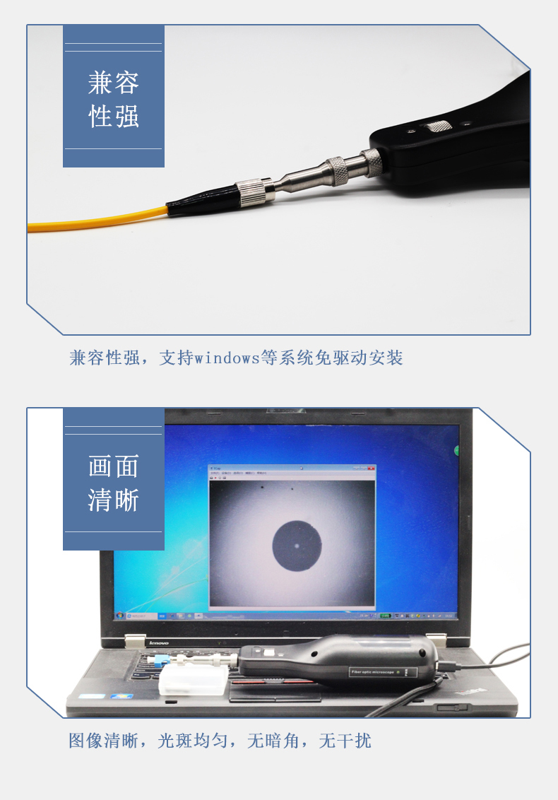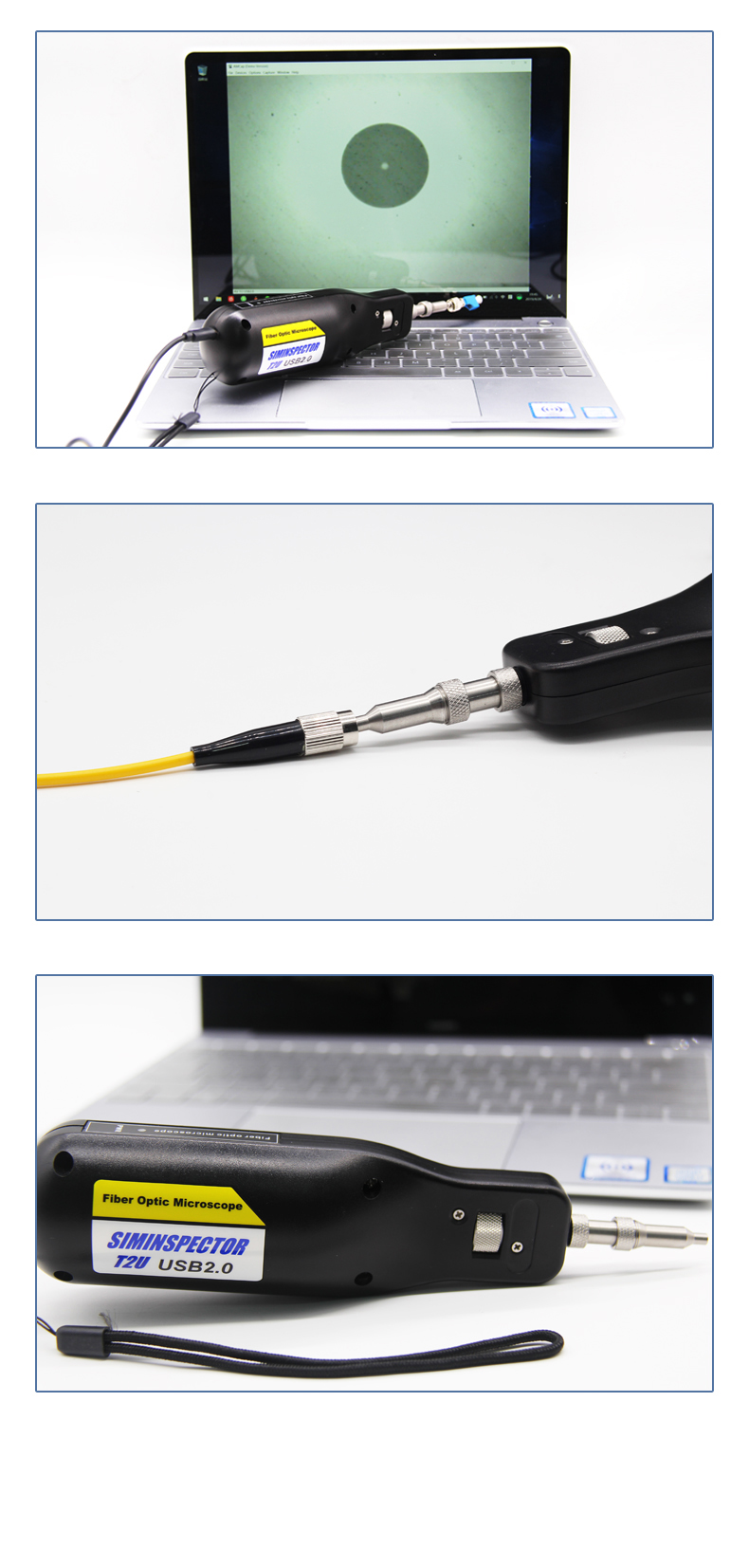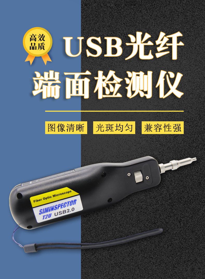 USB光纤端面检测仪 SIMINSPECTOR T2U通过USB端口连接电脑检测光纤端面,便于对图像分析;可检测SC、FC、ST、LC、E2000、MU等所有PC和APC的光纤连接器公头端面及适配器里面的母头端面。200倍放大能力,优于1μm分辨率;无需安装驱动,插入USB端口即可工作,支持USB1.1/USB2.0端口;图像清晰,光斑均匀,无暗角,无干扰;预中心定位,图像居中性好兼容性强,支持windows等系统免驱动安装;