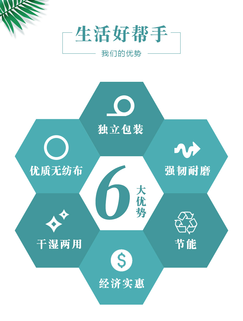 独立包装,易存放;优质无纺布;干湿两用;强韧耐磨,有耐性。