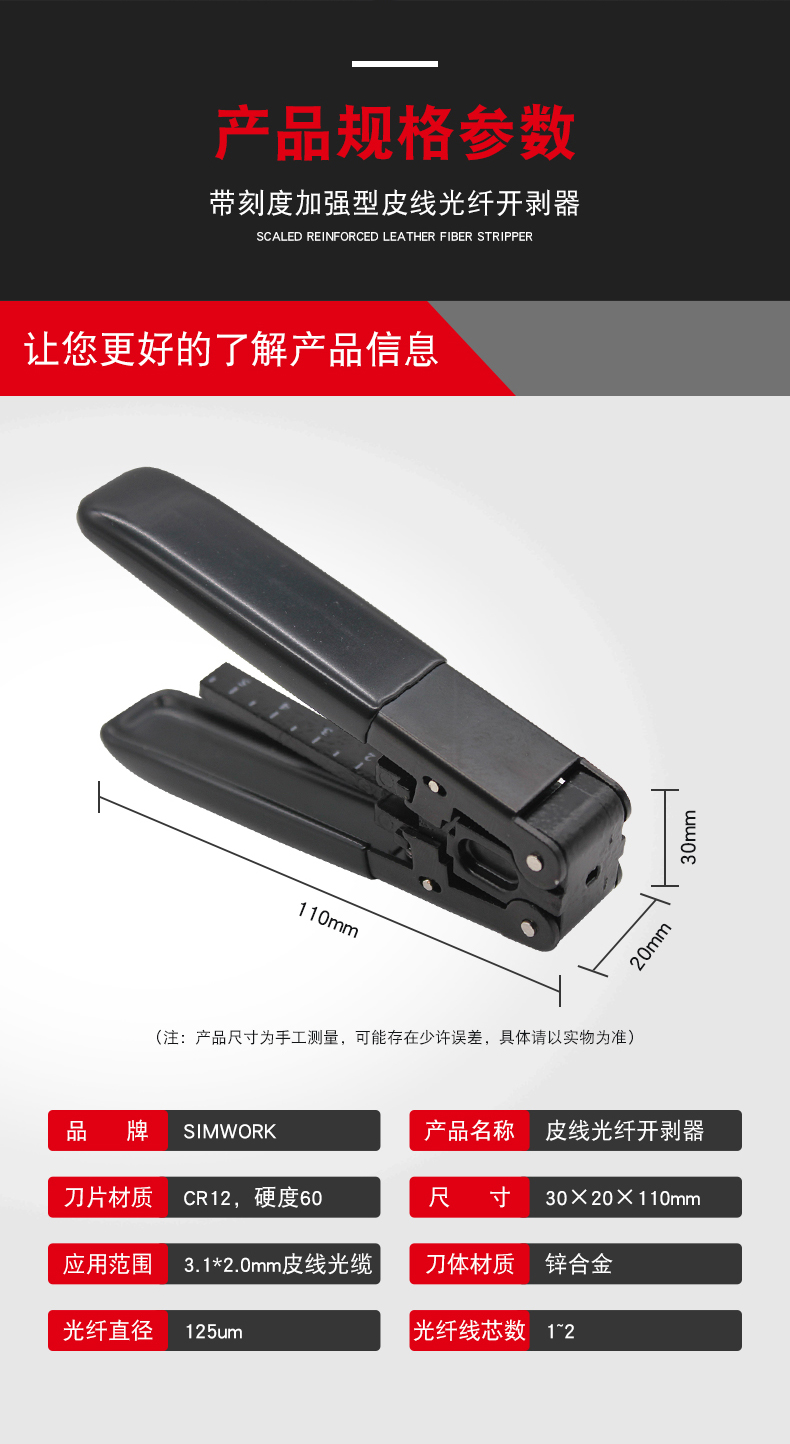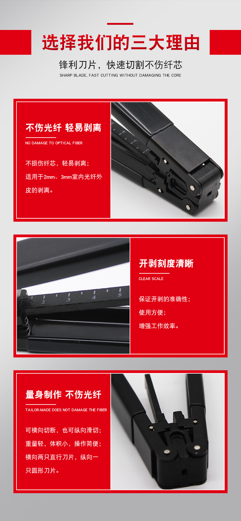 多功能一体 带长度定位 不伤光纤 轻易剥离 开剥刻度清晰 适用于2mm 3mm室外光纤外皮剥离